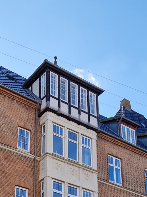 Overgangen mellem facade og tag markeres af en hovedgesims i tegl eller granit.
