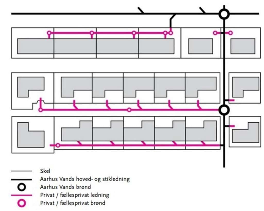 Aarhus Vands kloakledninger går som hovedregel til skel til den enkelte ejendom, hvilket betyder at kloaksystemet inde på den enkelte matrikel er privat.