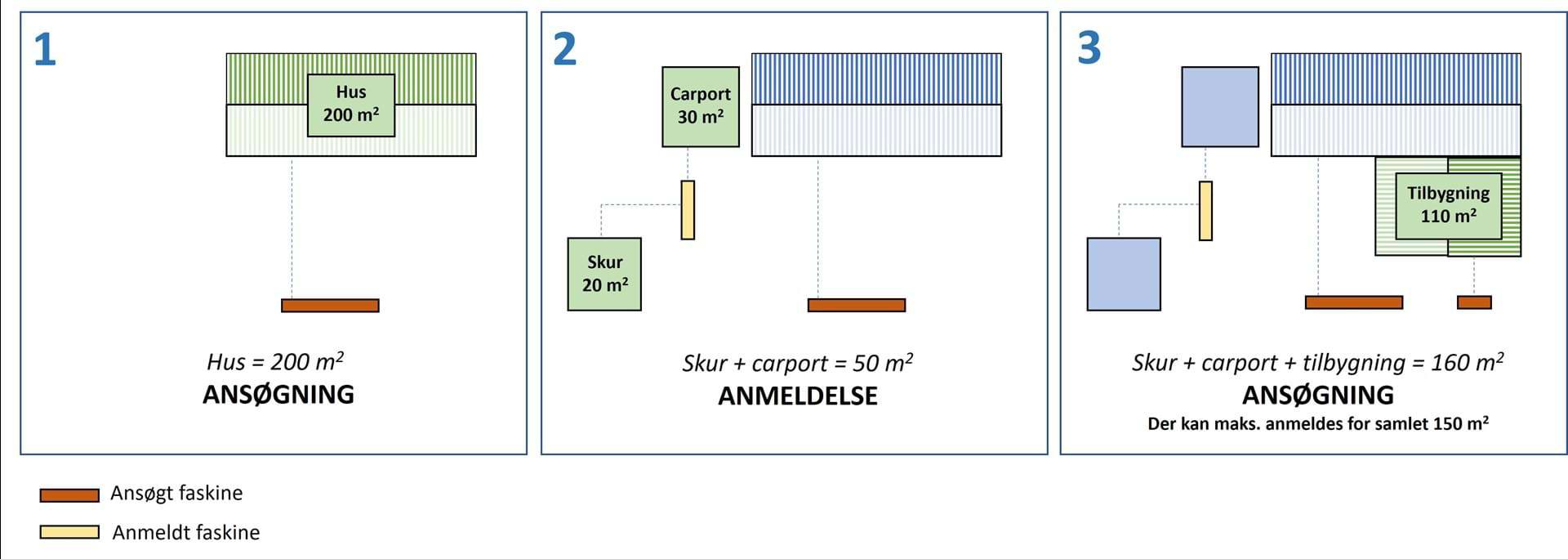 Hvis man ønsker at anmelde flere småbyggerier, som til sammen overstiger de 150 m2, skal man i stedet ansøge om nedsivningstilladelse. Se nedenstående eksempel.