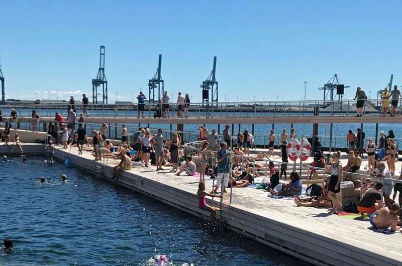Der er en adgangsbegrænsning på 350 personer i bassinområdet. Tjek det aktuelle besøgstal her: Havnebadet (odaa.dk)