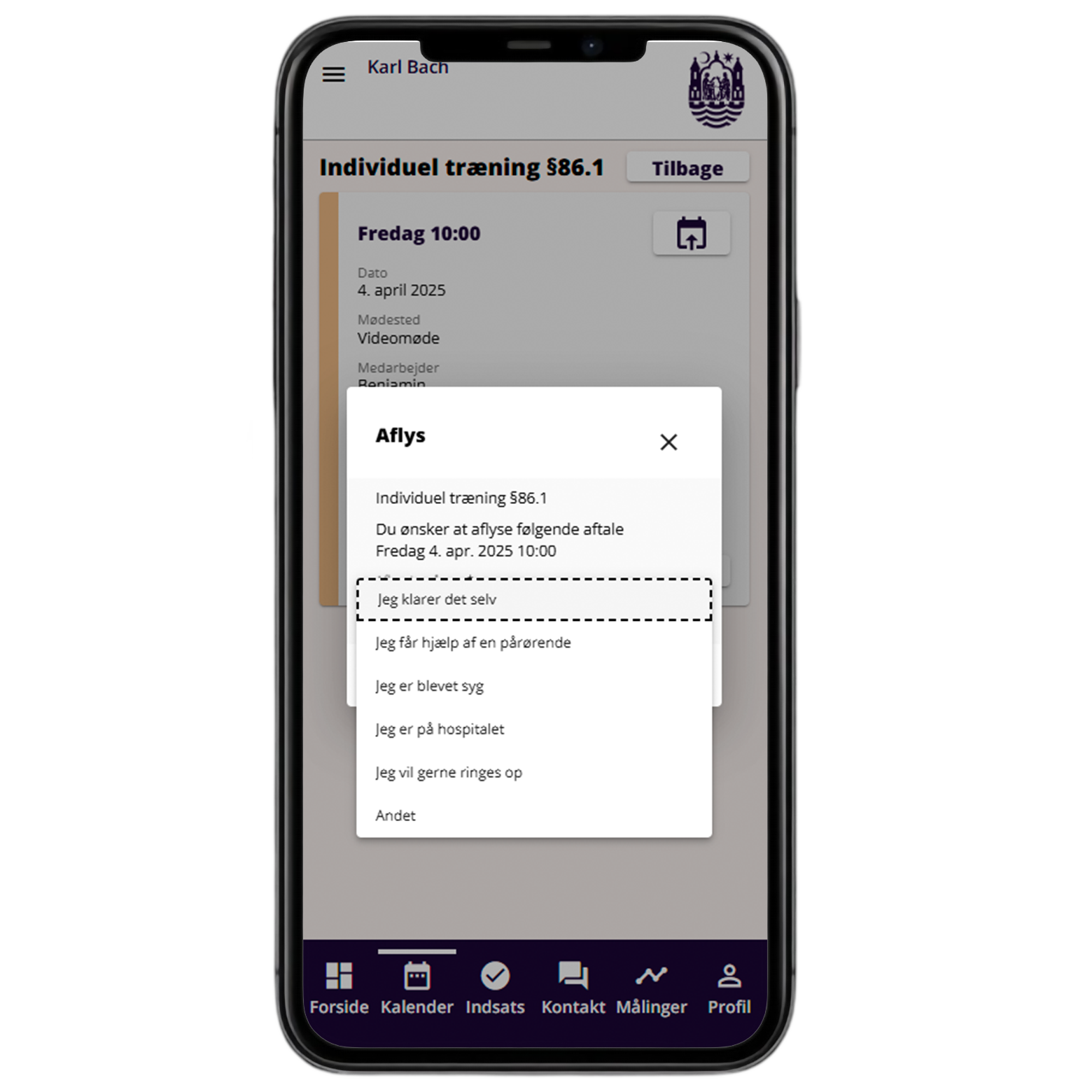 Hvis du vil aflyse din aftale, skal du angive en årsag. Du har disse årsager at vælge i mellem: