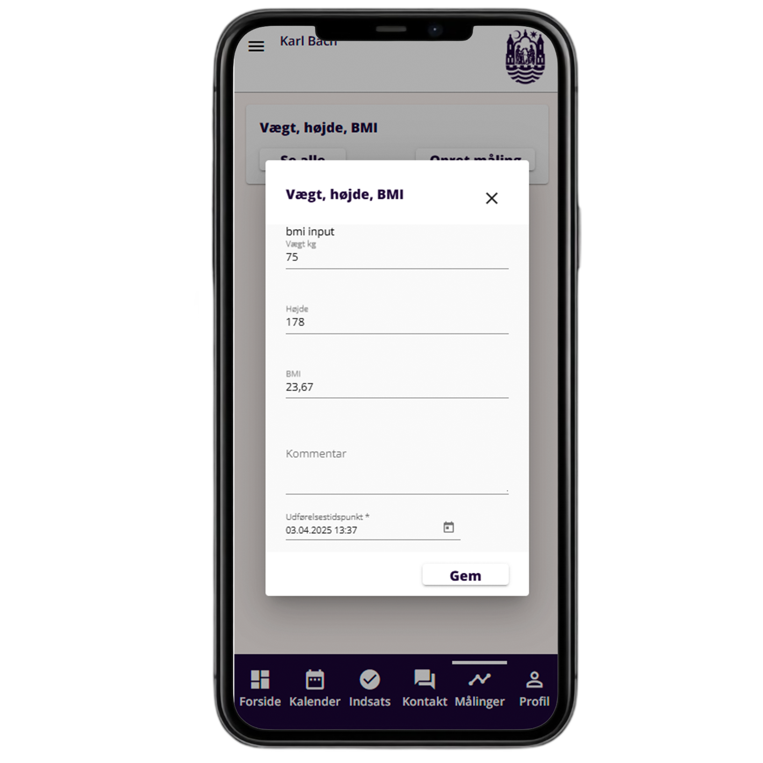 Efter aftale med din kontaktperson kan du under 'Målinger' få mulighed for selv at indtaste fx blodtryk, vægt, blodsukker, information om smerter og meget mere.