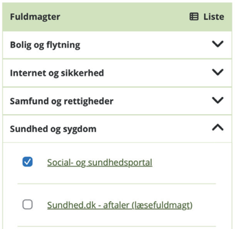 Vælg hvilken fuldmagt, du anmoder om. Vælg "Sundhed og sygdom" og sæt flueben ved "Social- og sundhedsportal".