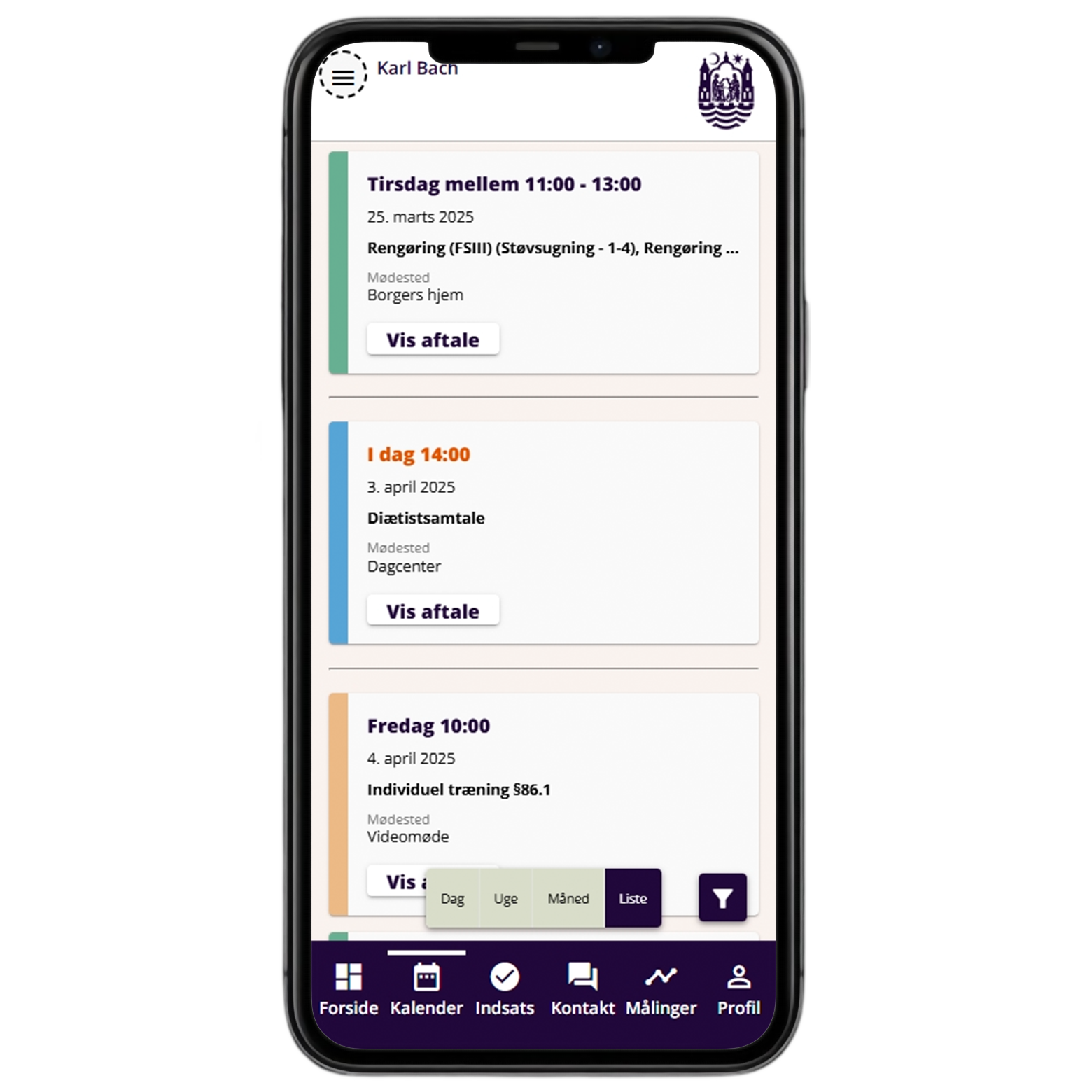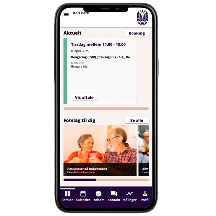 I kalenderen kan du se dine aftaler med Sundhed og Omsorg i Aarhus Kommune, som fx hjemmehjælp og rengøring, træningsaftaler og videokonsultationer.
