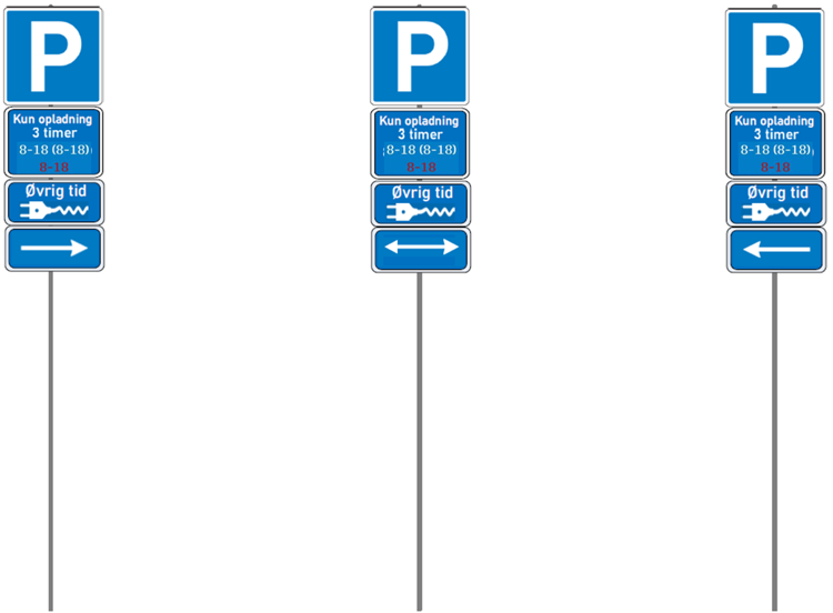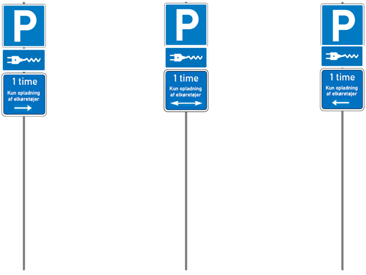På steder hvor der er opsat en ladestander og skiltet med elbilsymbol og tidsbegrænsning, kan kun elbiler og hybridbiler parkere, og parkeringsskiven skal indstilles.