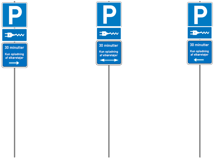 Ved lynladere viser skiltene: Kun opladning af elkøretøjer – maks. 30 minutter hele døgnet.