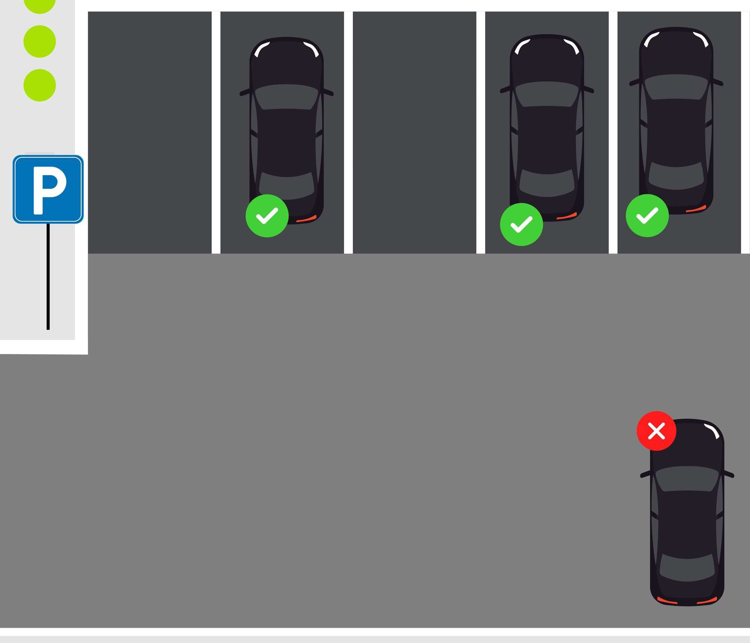 Reglen er illustreret på billedet nedenfor. Bilen ved det røde kryds er parkeret uden for en bås. Den er således parkeret ulovligt. Derimod er hver af de øvrige biler parkeret inden for en enkelt parkeringsbås og er således parkeret lovligt.