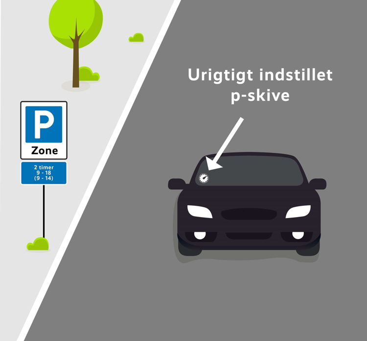 P-skiven skal indstilles på tidspunktet for parkeringens begyndelse (fra nærmeste kvarter). Såfremt p-skiven er indstillet, men parkeringstiden er udløbet, vil køretøjet modtage en parkeringsafgift.