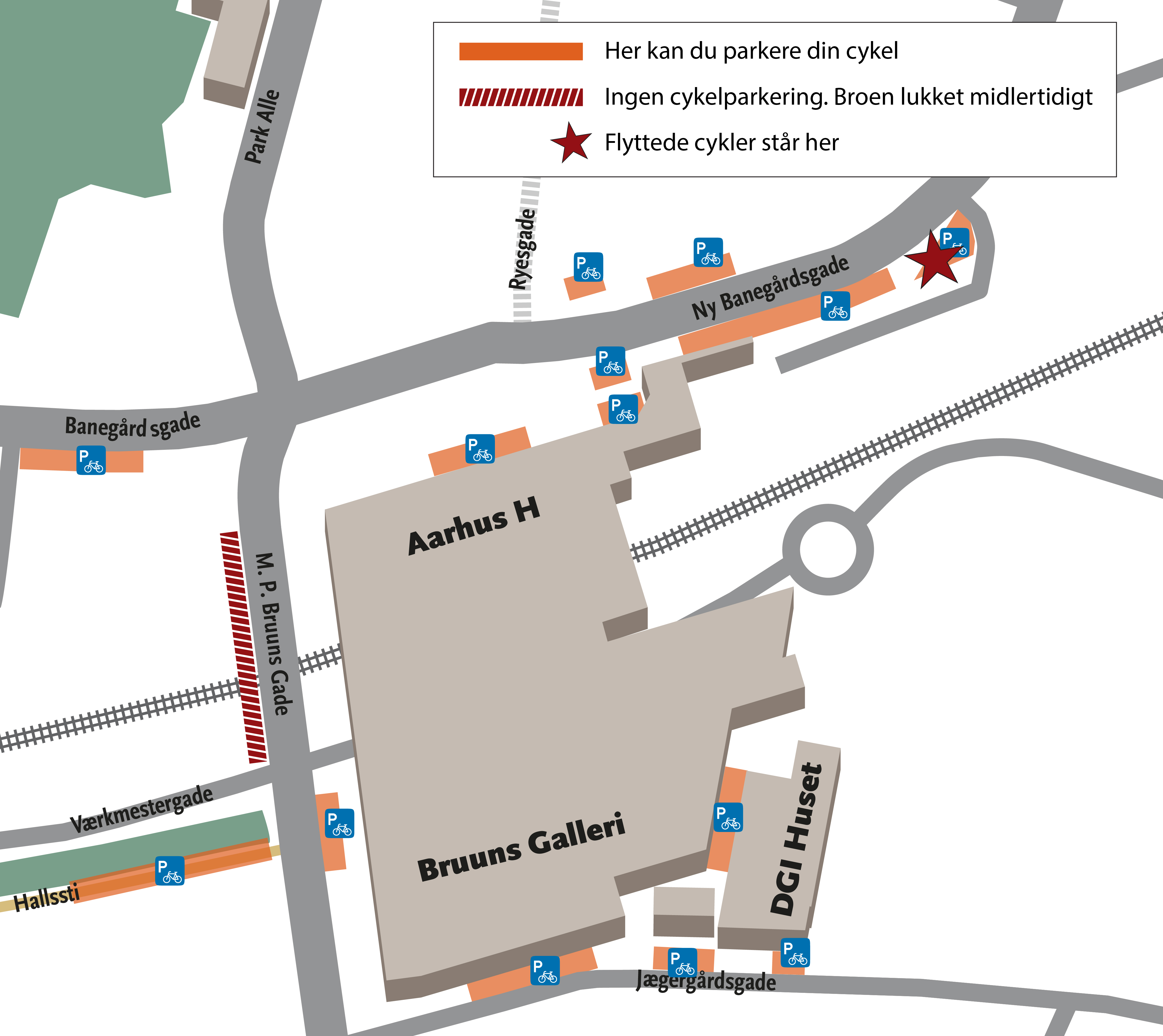Alle cykler, der eventuelt står tilbage efter d. 15. april, flytter vi over i Ny Banegårdsgade. Se placeringen her markeret med stjerne: