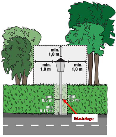 På tegningen nedenfor kan du se, hvad du som minimum skal beskære, så det er muligt at komme til både masten og lampehovedet. Beskæringen skal også sikre det forventelige lysoutput.