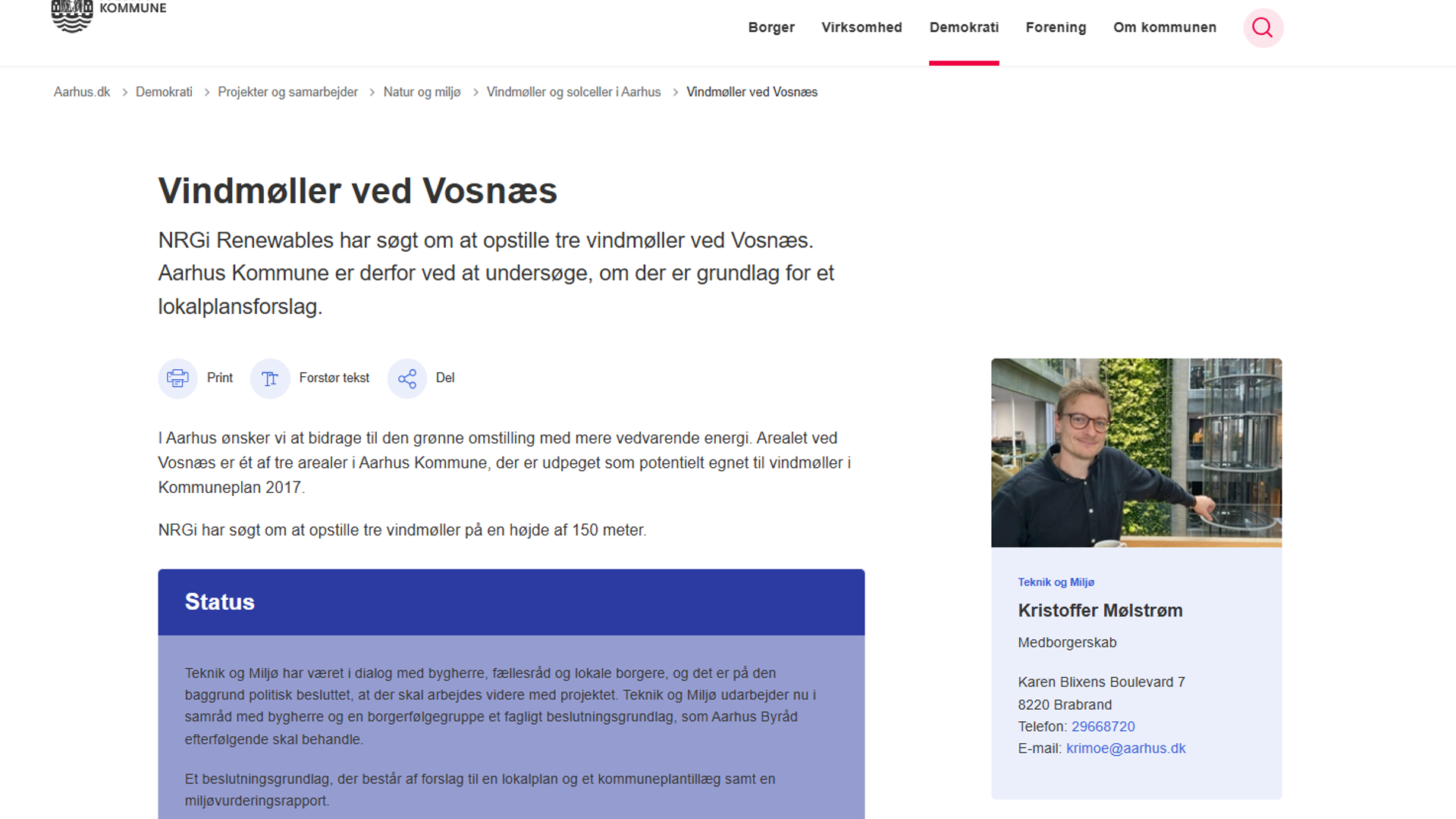 En udvikler ønsker at opstille tre vindmøller ved Vosnæs. Aarhus Kommune accepterede anmodningen, undersøgte mulighederne og har efterfølgende besluttet at udarbejde et forslag til en lokalplan