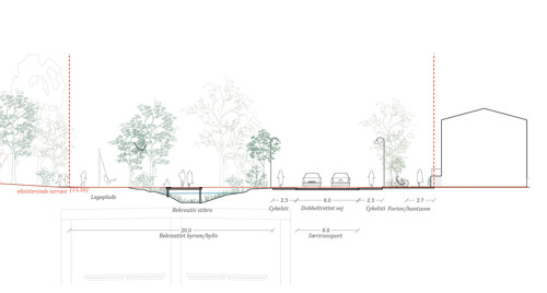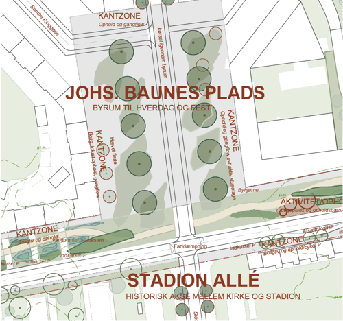 Det bærende greb i gade- og byrumsplanen er et blå-grønt parkstrøg på den nordlige side af boulevarden, som er solsiden. Her bliver plads til ophold og byliv i solen samt en gennemgående, rekreativ sti. I den sydlige side bliver der plads til trafikken i to spor (et spor i hver retning) samt cykelstier. Der vil fortsat være brede, gennemgående fortove langs bygningsfacaderne i begge sider.