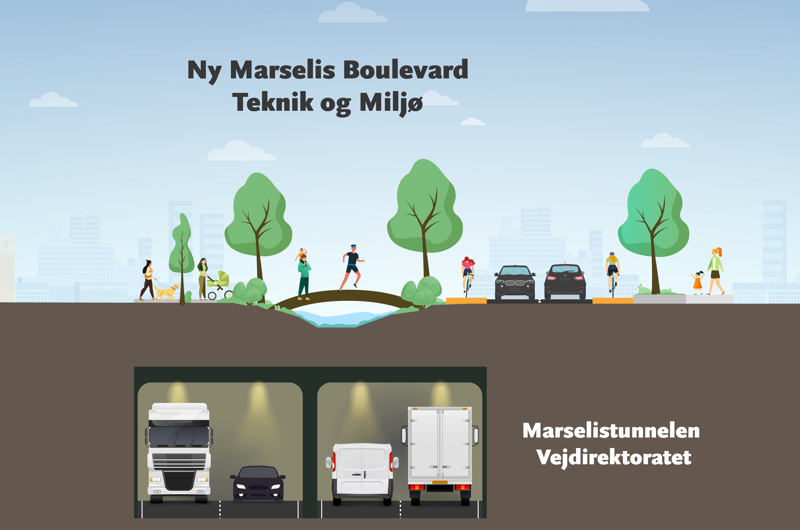 Med Marselistunnelen får trafikken til og fra Aarhus Havn en direkte forbindelse under jorden fra Aarhus Syd Motorvejen. Det betyder, at den tunge trafik på Marselis Boulevard bliver mindre. Derfor gentænker og omdanner vi Marselis Boulevard. Der vil stadig være plads til biltrafikken i to spor (et i hver retning), men her vil blive mere og bedre plads til byliv, cyklister og gående.