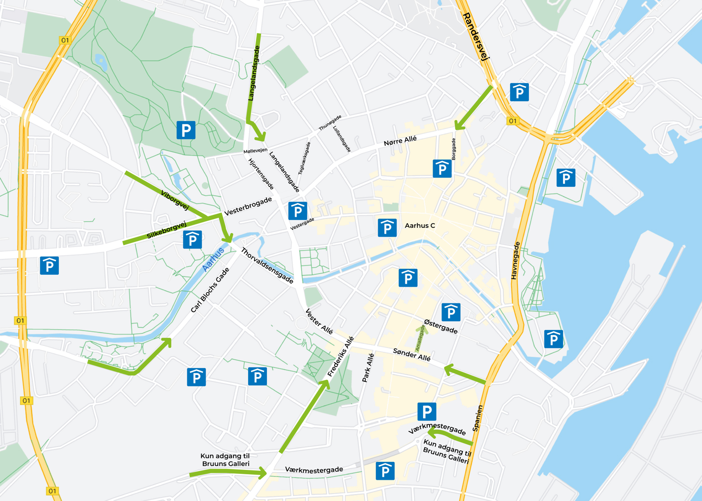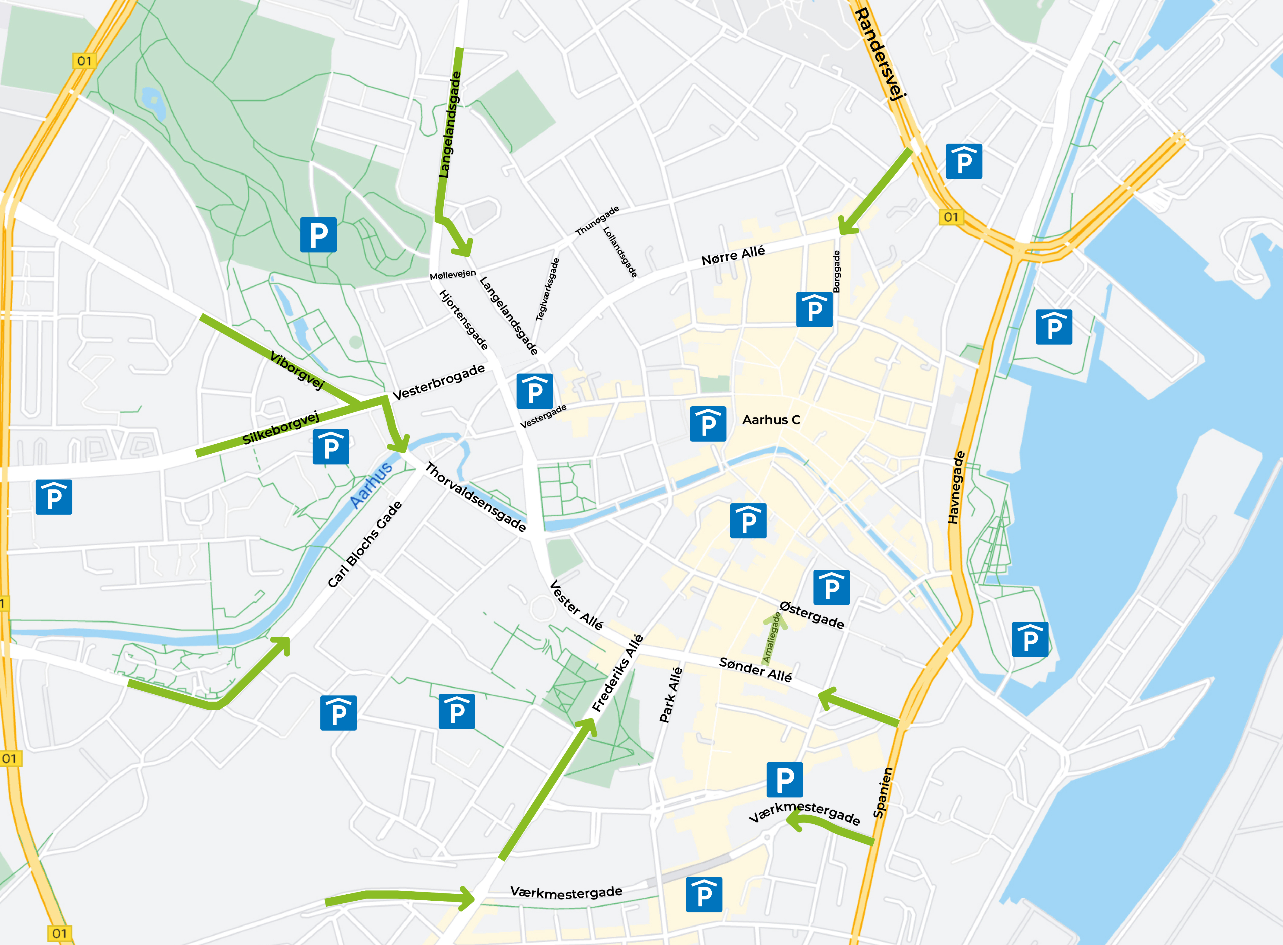 De større veje ind til midtbyen i bil, som fortsat er mulig at bruge, samt parkeringshuse og -anlæg med offentlig adgang. I øjeblikket er Sønder Allé spærret, fordi en bygning er i fare for at styrte sammen. Adgang til Sallings p-hus sker derfor via Amaliegade.