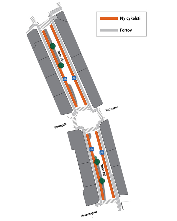 Se på kortet her, hvor der kommer cykelstier omkring Vesterbro Torv