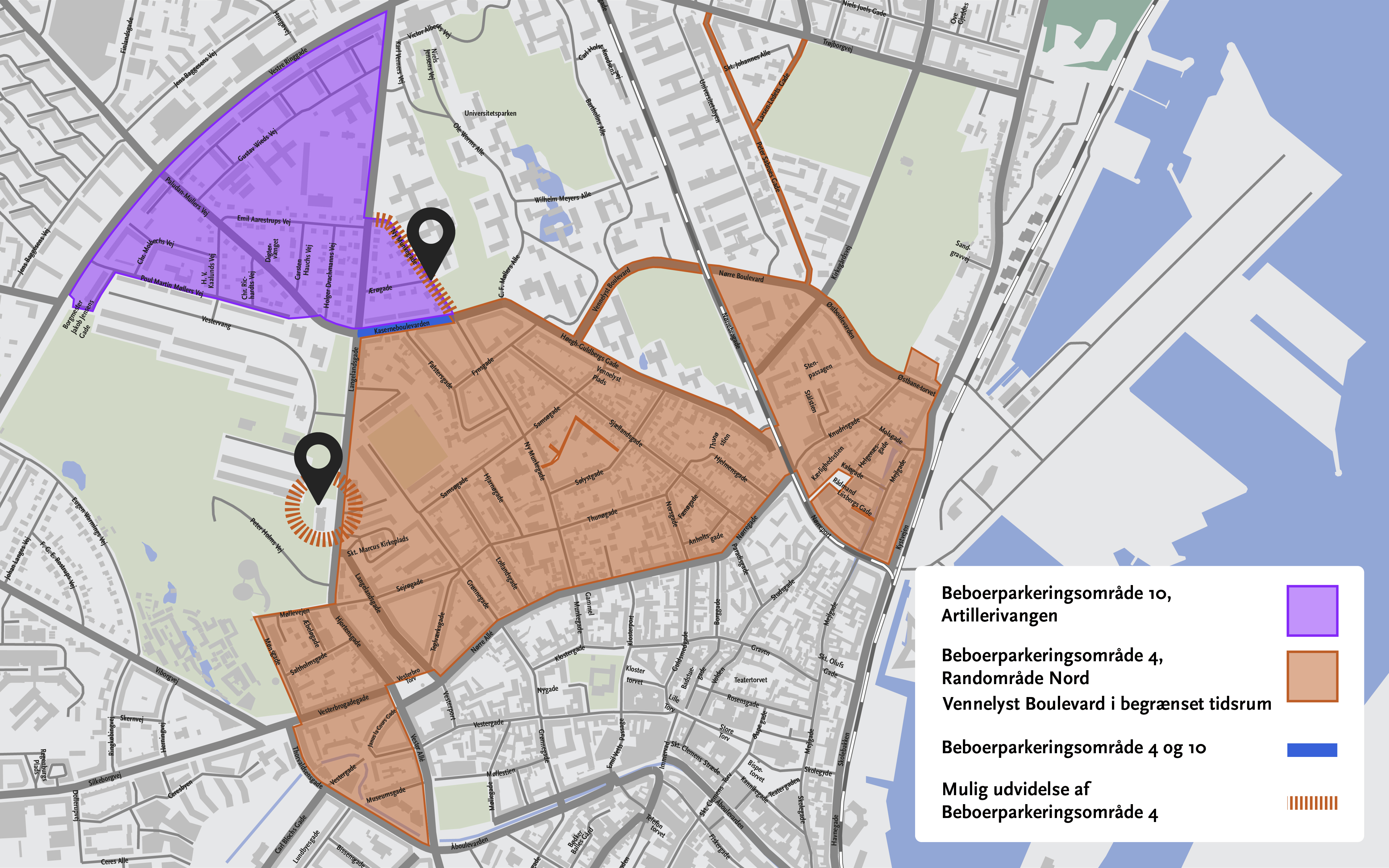 Beboerparkeringsområde 4 kan udvides med den nordlige del af Ny Munkegade, hvor en stor del af de 72 parkeringspladser ofte er ledige. Vejen huser villaer med egen parkering og hører til beboerparkeringsområde 10, Artillerivangen. Ligesom en del af Kaserneboulevarden kan strækningen indgå i begge områder, så beboere begge steder kan parkere ubegrænset med en beboerlicens. Denne løsning kræver godkendelse i byrådet. Byrådet behandlede sagen d. 18. marts og besluttede, at By- og Planudvalget skal kigge nærmere på løsningen og afklare en række spørgsmål. Du kan se byrådsdebatten her - gå til pkt. 16.