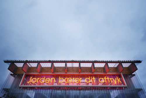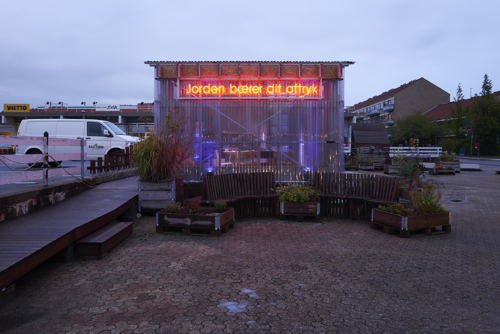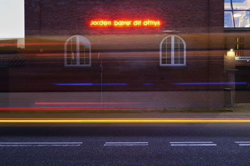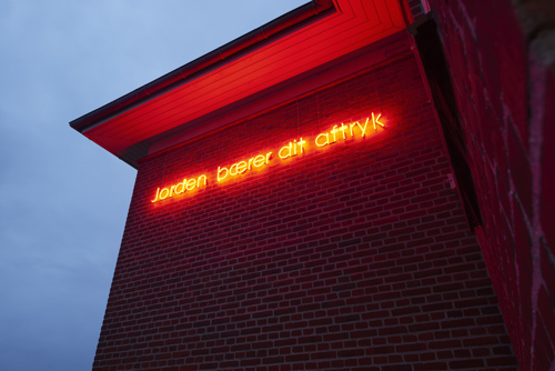 "Jorden bærer dit aftryk" er et vidt berejst neonkunstværk af aarhusianske billedkunstner Astrid Gjesing, som nu har fundet fodfæste sammen med et nyt, sammenhængende lydkunstværk af lydkunstneren Sofie Birch, fra København.