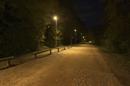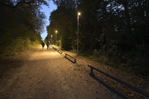 Når stien ikke bruges, ulmer lyset på lavt blus, for at sikre et godt snit mellem mørke og tryghedsskabende lys, langs dette naturstræk.