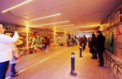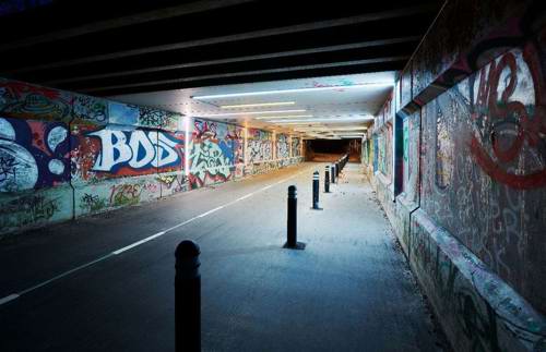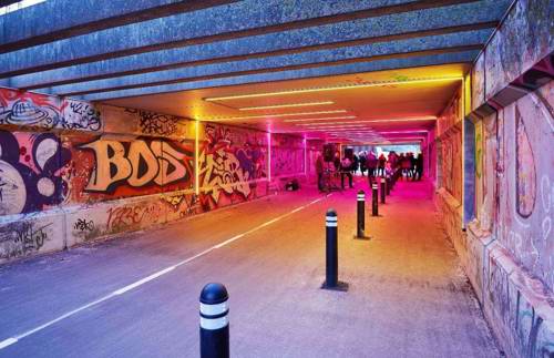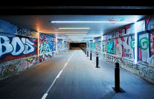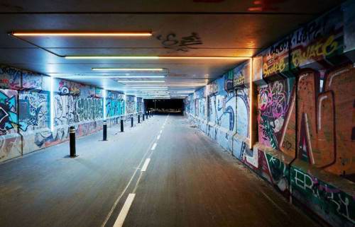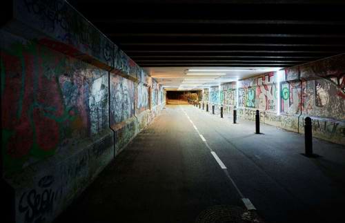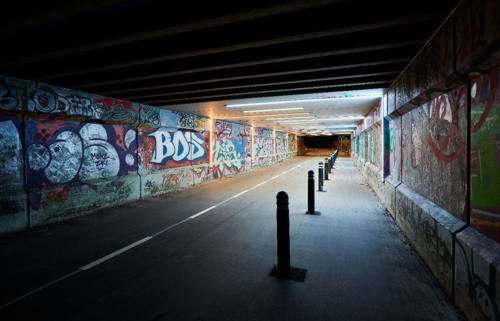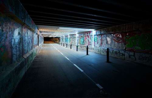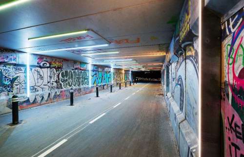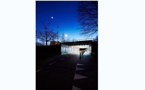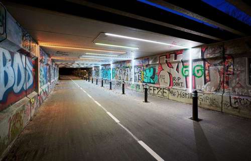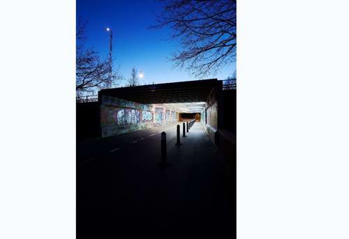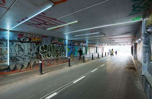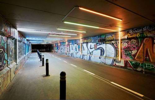 Til projektet benyttes 44 iGuzzini Underscore armaturer i et design, som tager afsæt i tunnelens arkitektoniske kvaliteter og karakter, bl.a. via en gengivelse af beton-lamellerne i tunnelens indgangspartier. Armaturerne er monteret i specielt fremstillede flanger, som skal sikre en høj modstandsdygtighed overfor vandalisering. Dertil tager opsætningen hensyn til tunellens arkitektur og tunnelens karaktergivende graffitimalerier.