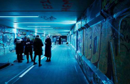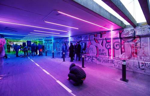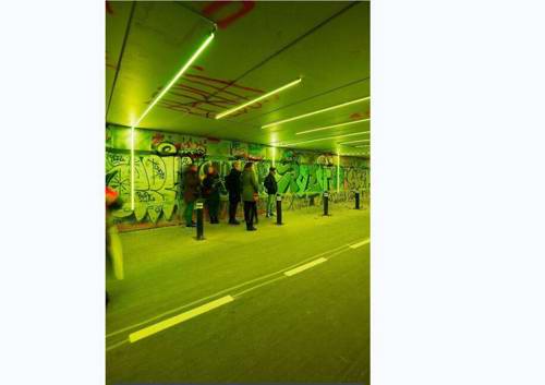 Belysningen blev udviklet i samarbejde med Aarhusianske Moto Muto ApS, som har stor erfaring med aktivitetsfremmende belysning af tunneler.