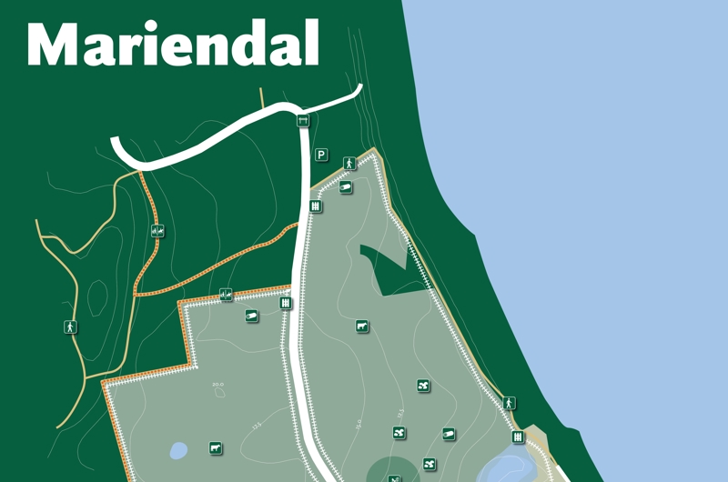 Området ved Mariendal er det lysåbne naturlandskab omgivet af skov og hav. Lavninger vil blive fyldt med vand i våde perioder og området vil få drypvise grupper af småtræer og buske.