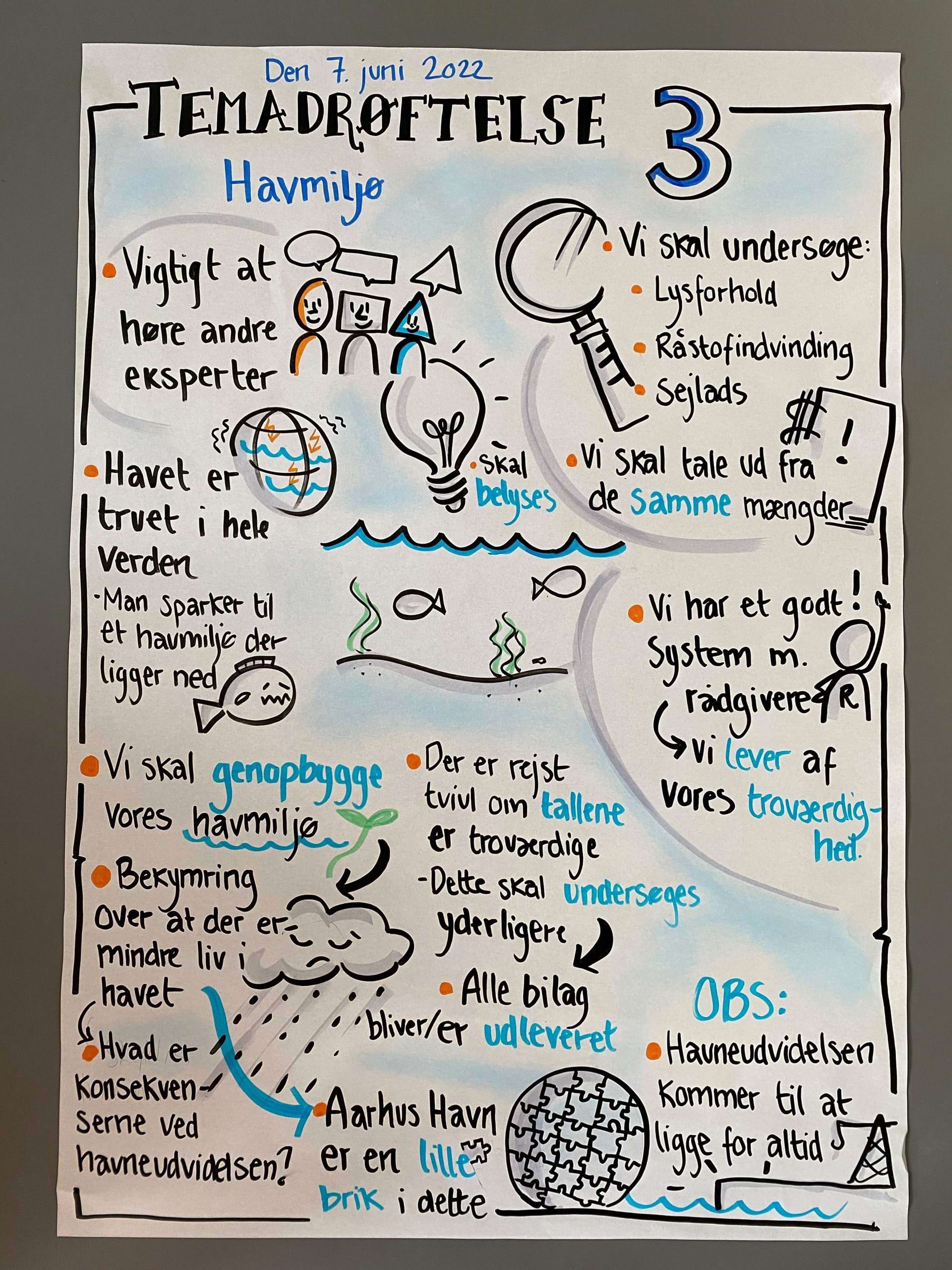 På temamødet gennemgik COWI dele af rapporten, og der var oplæg fra eksterne fagpersoner. Det gav både spørgsmål og debat. Der var især to temaer i debatten. Det ene er de lokale konsekvenser af klapning. Det andet tema er havmiljøets tilstand og den måde, havneudvidelsen påvirker det.