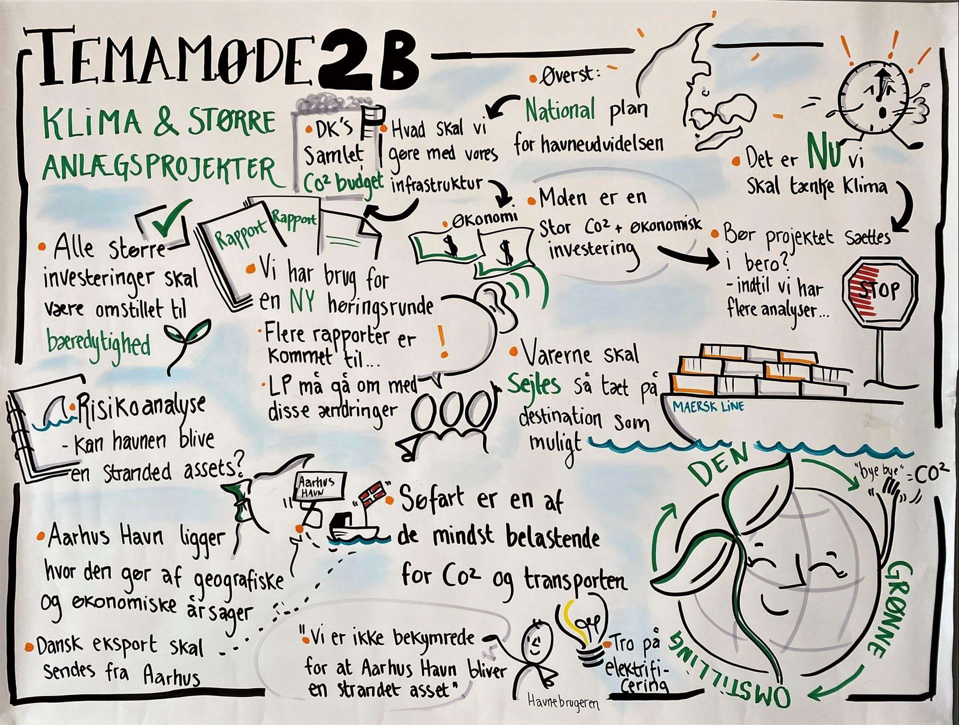 Forvaltningschef Luise Pape Rydahl indledte temaet med en kort rammesætning af mødet, og en italesættelse af, at man denne gang har bevæget sig op på samfundsmæssigt perspektiv, selvom dette ikke er en direkte del af myndighedsbehandlingen. Indledningsvist bidrog to eksterne med et oplæg, som ikke er direkte relaterede til projekter, men på mere generelt niveau taler om store anlægsprojekter ind i en klimasammenhæng. Derefter bidrog Aarhus Havn med justeringsforslag til anlægsfasen og krav til et kommende udbudsmateriale, som vil kunne reducere CO2-udledningen væsentligt.
