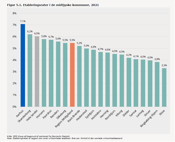 - Aarhus Kommune er klart den af kommunerne i Region Midtjylland, hvor der er højst etableringsrate – dvs. hvor stor en procentdel af nyetablerede virksomheder, der findes i kommunen i forhold til kommunens samlede virksomhedsbestand. Her ligger Aarhus i top med 7,1 procent og dermed markant over landsgennemsnittet på 6,0. Gennemsnittet for regionen er på 5,5 procent. Nummer to i regionen er Skanderborg med 6,2 procent.
