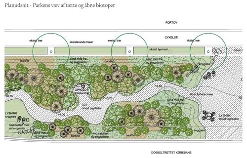 De grønne byrum anlægges på det eksisterende underlag, og terrænet skabes blandt andet af oppumpet sand fra kanaludgravning, fældede popler fra Ringgaden, efterladte joller fra bådoplagsplads, opgravede marksten fra byggepladser og store egetræer på Kalkværksvej.