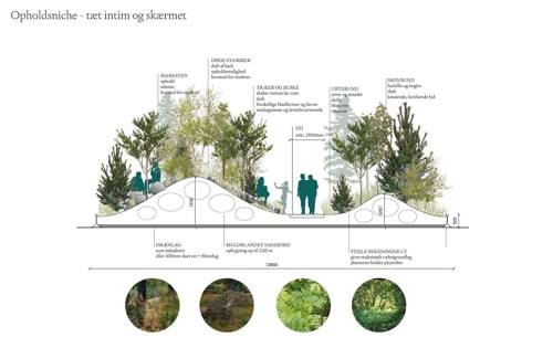 Denne første lomme etableres som bakker med buske og træer. Bakkerne giver plads til beplantning og skaber mindre rum og udsigter til bassinet.