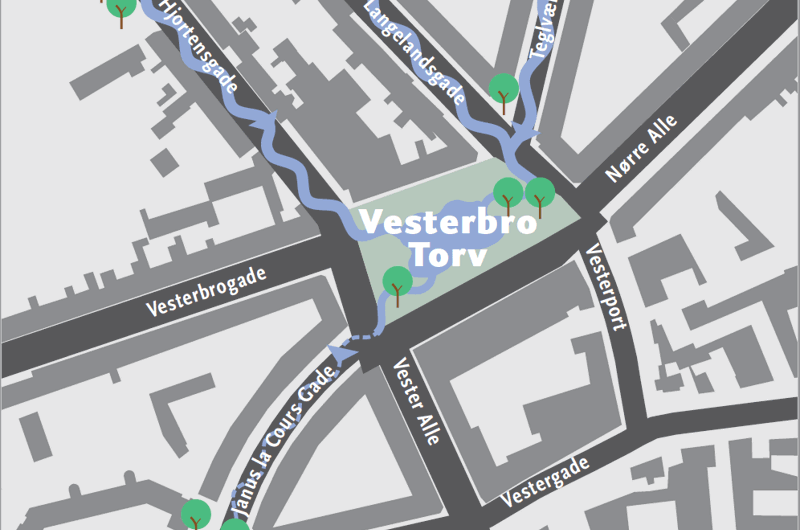 Vesterbro Torv bliver centrum for et af de hidtil største klimatilpasningsprojekter i Aarhus Midtby. Det centrale torv kommer til at kunne parkere op til tre skybrud på én gang – det svarer til 330.000 liter, som skal have plads på terræn. Vandet skal bidrage til forskønnelsen af torvet og give liv til meget mere bynatur.