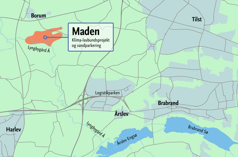 Maden ligger mellem Tilst og Harlev og består primært af landbrugsjord, men også dele af en golfbane. Undersøgelser viser, at det er teknisk muligt at parkere 1,1 mio. m3 vand i området. Lige nu er en forundersøgelse blandt lodsejerne i gang. Den skal afklare, om de vil indgå aftale om at lade dele af deres marker oversvømme for at undgå alvorlige oversvømmelser omkring Brabrand Sø og dele af Aarhus Midtby.