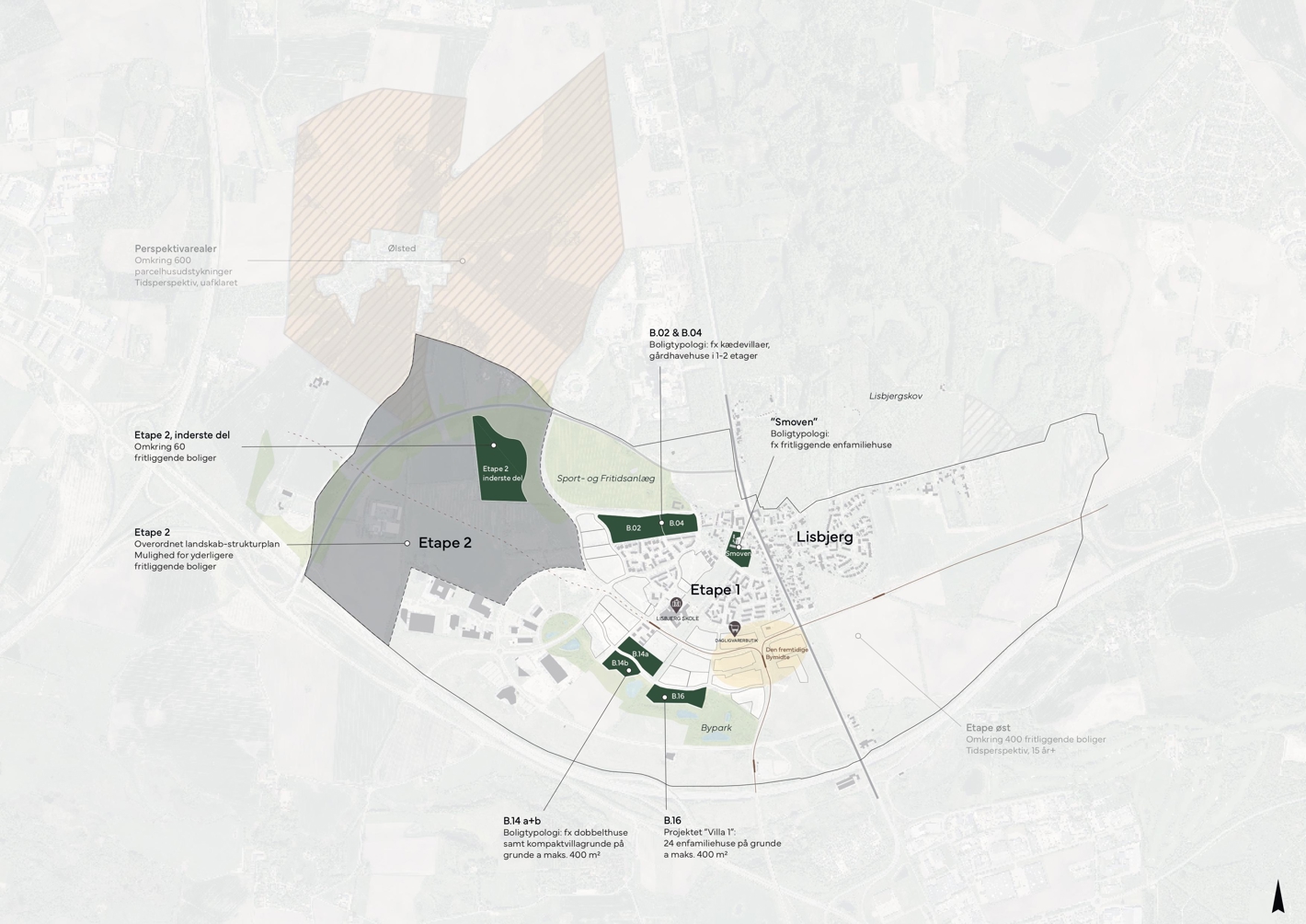 - Byggefelt 16: Under salg til kompaktvillagrunde med projektet ’Villa 1’, som består af 24 enfamiliehuse på ca. 130 m2 på ca. 400 m2 grund