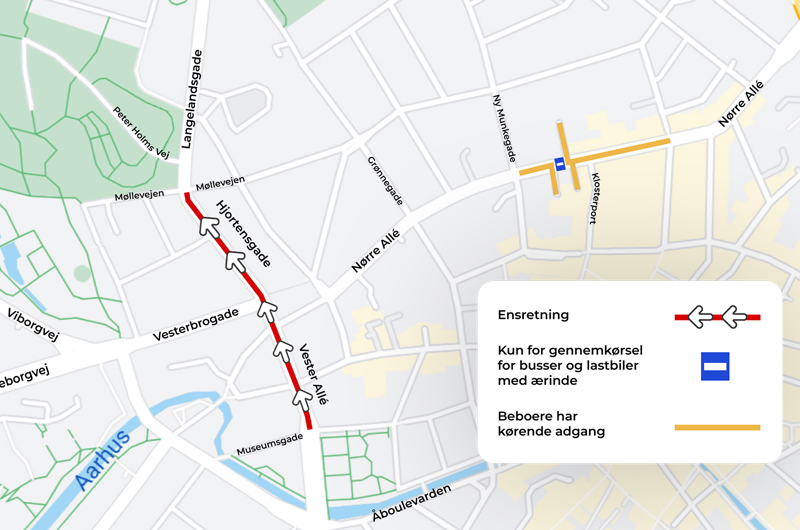 Den nordlige del af Vester Allé og Hjortensgade bliver ensrettet i nordgående retning. Efter et ønske fra beboerne i området er de oprindelige planer ændret, så ensretningen nu starter syd for Møllevejen, så beboerne fortsat kan komme hjem i bil via Langelandsgade.