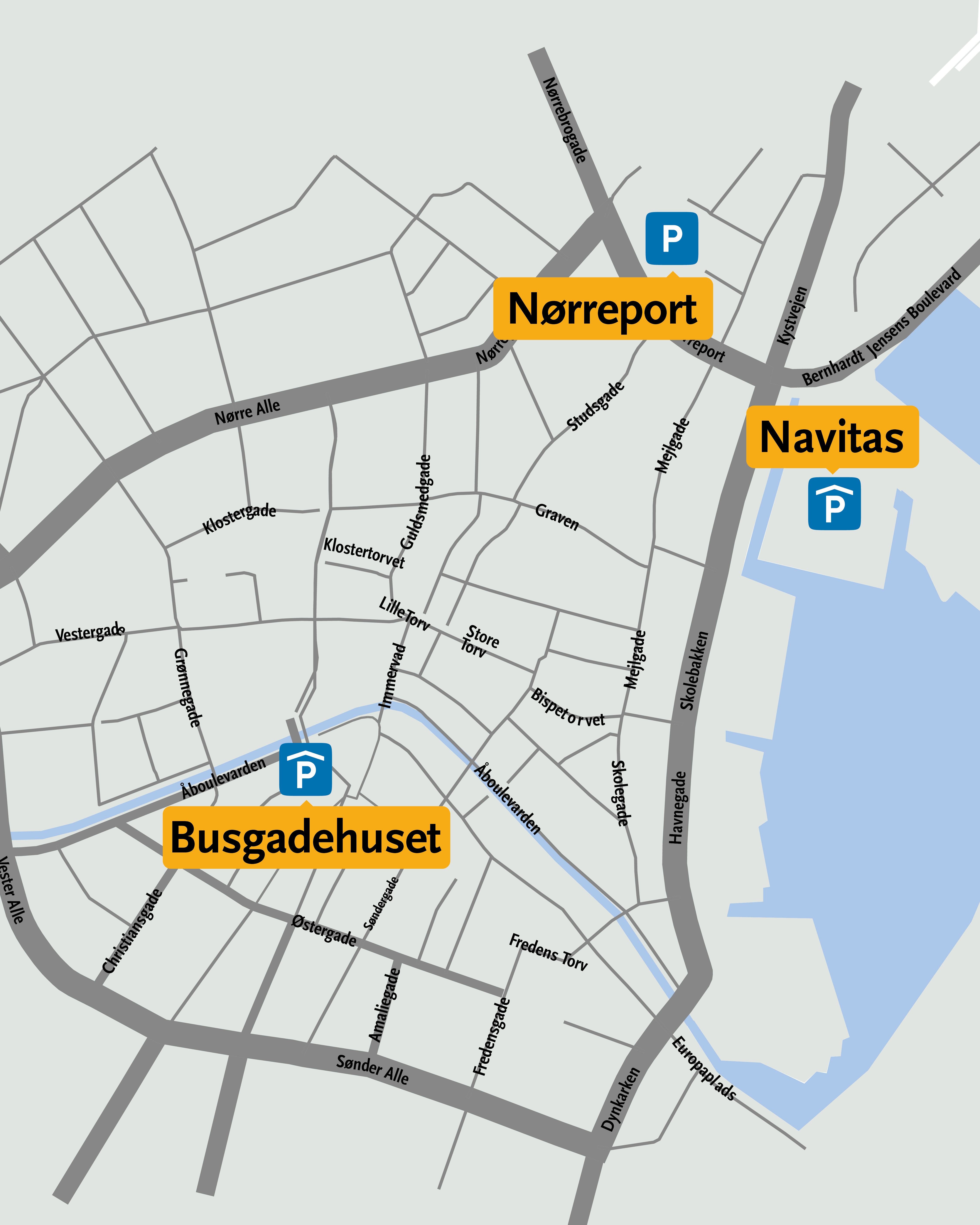Kommunale p-anlæg, der tæller Navitas, Busgadehuset og Nørreport, ligger nemlig i grøn zone, hvor man betaler 16 kroner i timen mellem kl. 8 og 19 på hverdage og mellem kl. 8 og 16 på lørdage – derudover er det gratis at holde der. Til sammenligning koster det 24 kroner i timen at holde på gaden, og i de private p-huse er det ejerne selv, der sætter prisen for parkering.