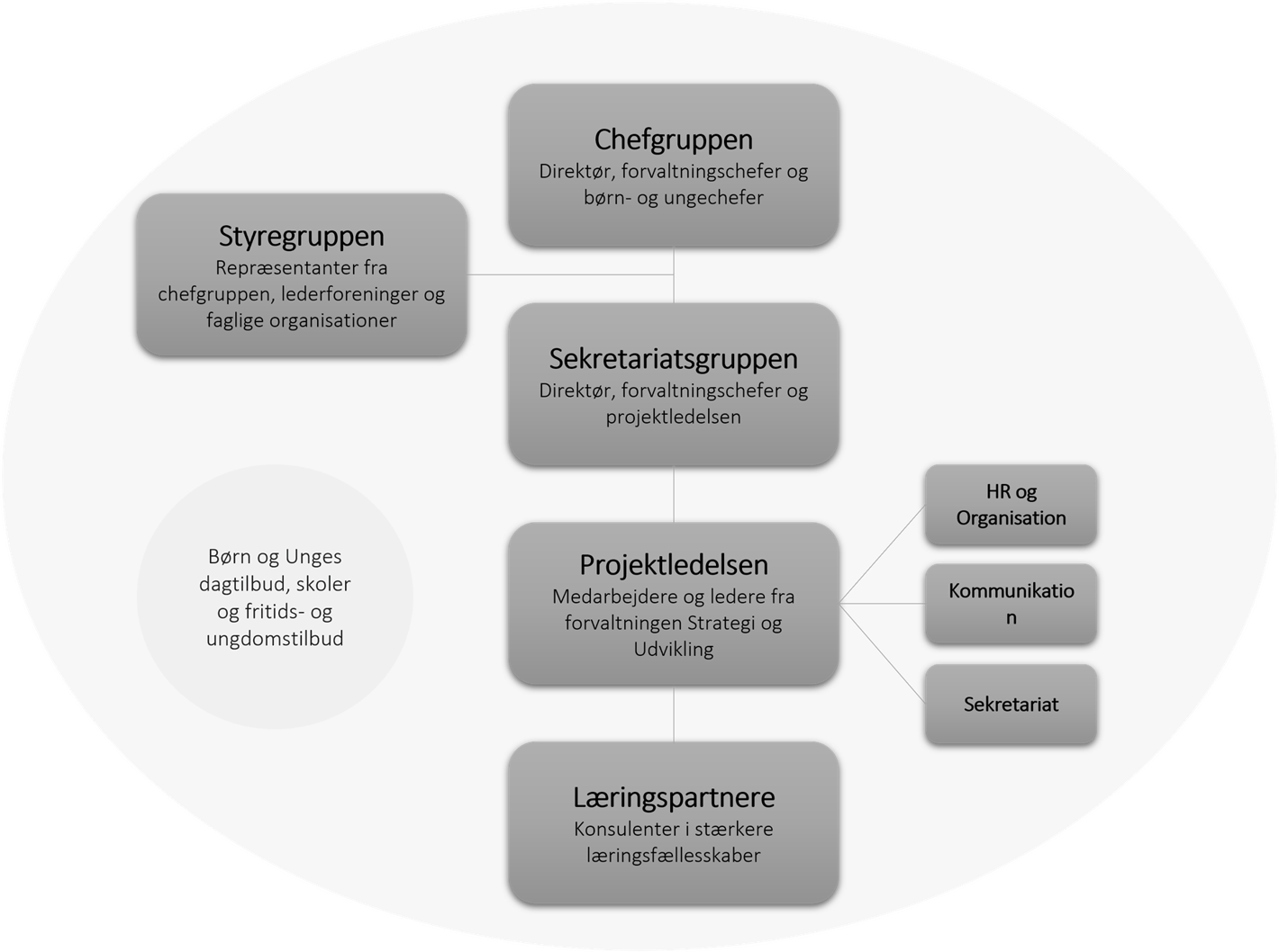 Udviklingen af stærkere læringsfællesskaber er forankret øverst i ledelseslinjen i Børn og Unges chefgruppe. Herunder er der nedsat en styregruppe, en sekretariatsgruppe og projektledelsen.