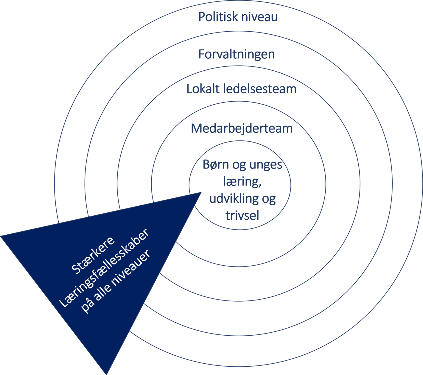 Organiseringen af Stærkere Læringsfællesskaber tager afsæt i en whole system approach, hvor vi stræber mod at skabe sammenhængskraft og en fælles forståelse for kulturudviklingen på tværs af alle organisatoriske niveauer; fra politisk niveau til det enkelte medarbejderteam. Stærkere Læringsfællesskaber dækker hele 0-18 års området (dagtilbud, skole og fritids- og ungdomstilbud) samt de forskellige forvaltninger, også kaldet fællesfunktionerne.