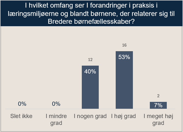 Den første feedback fra medarbejderne viser, at de i høj grad oplever, at de udvikler deres pædagogiske praksis med Dagtilbud for alle, og at det har skabt et grundlag for at styrke Bredere børnefællesskaber. Medarbejderne oplever, at de: