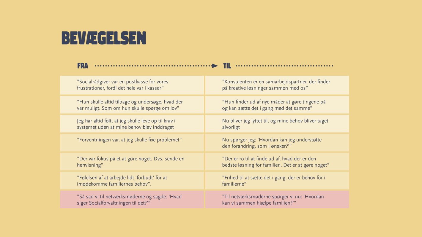 Når samarbejdet modnes, er det målet, at familierne oplever en hurtigere og mere koordineret hjælp. Hjælpen når hele vejen rundt om barnet og dets børnefællesskaber fra vuggestuen, til udskolingen eller klubben – og familien er med til at se og udvikle nye muligheder, før udfordringer vokser sig større. Tilsammen har de en bred viden og familiens egne ønsker og drømme som et udgangspunkt for samarbejdet.