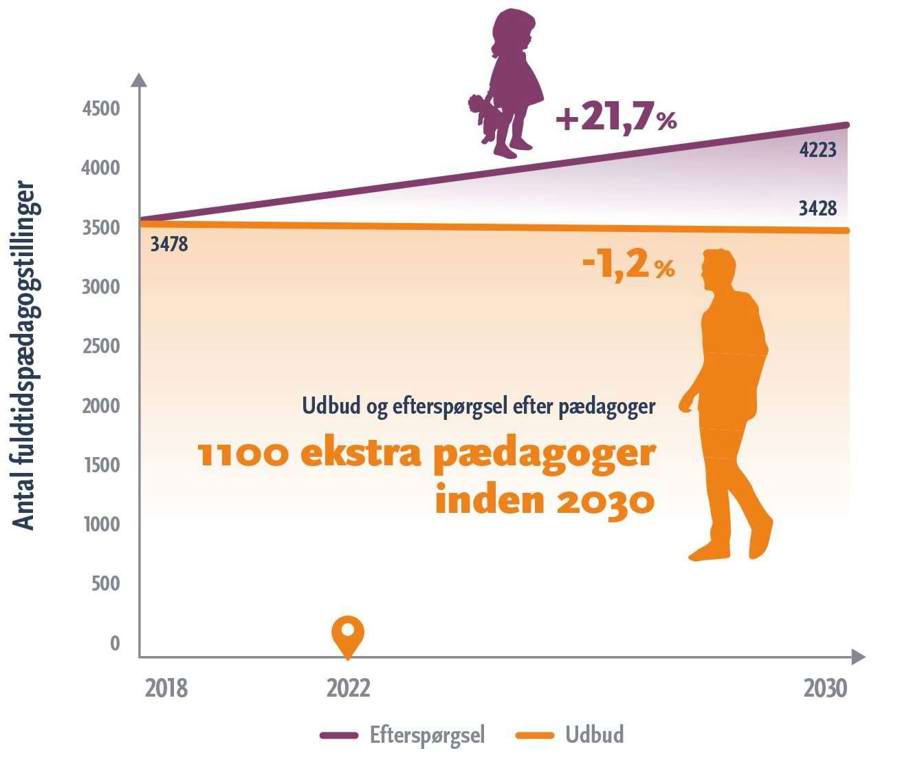 Inden 2030 vil Aarhus komme til at mangle cirka 800 fuldtidsstillinger, hvilket svarer til 1.100 flere pædagoger. Og lægger vi minimumsnormeringer og et ønske om mere uddannet arbejdskraft oveni, forventes efterspørgslen efter pædagoger at stige yderligere.