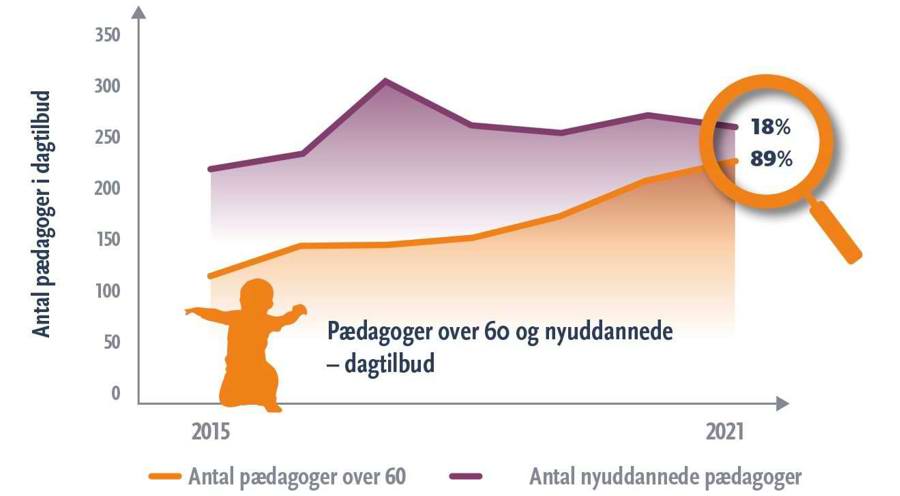 Fra 2015 til 2021 er antallet af pædagoger over 60 år steget med 89 % i dagtilbuddene i Aarhus, mens antallet af nyansatte nåede 18 %.