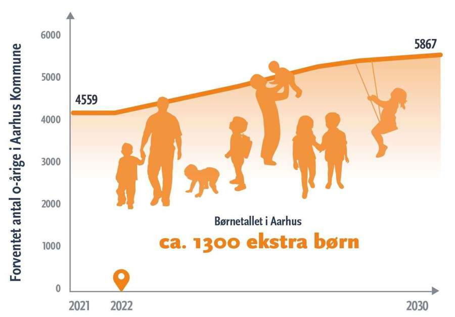 For Aarhus Kommunes fire nabokommuner – Favrskov, Odder, Skanderborg og Syddjurs – forventes børnetallet at stige med ca. 22 % i samme periode.