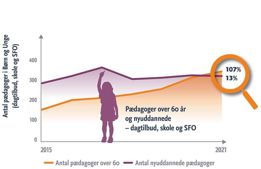 Samme tendens gør sig gældende på tværs af Børn og Unges dagtilbud, skoler og SFO'er. Her steg antallet af pædagoger over 60 år med 107 % fra 2015-2021, mens antallet af nytilkomne pædagoger i Børn og Unge voksede med 13 %.