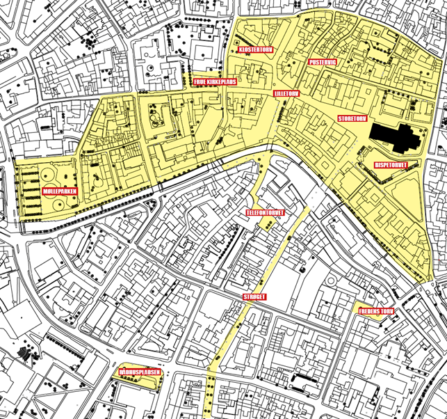 På de markerede områder på kortet nedenfor i Aarhus Midtby, kan der stilles særlige krav til belægningstyper i kabelbrøndes dæksler. Der kan være yderligere områder, der ikke er vist på dette kort.